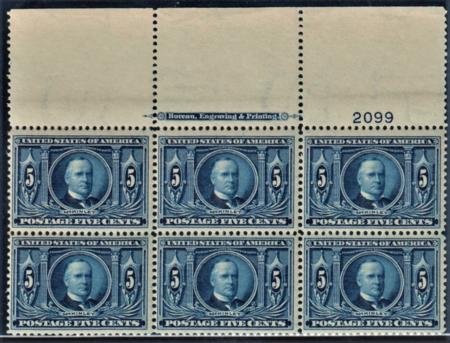 US 326 Early Commemoratives F-VF NH Top Plate Block of 6 cv $1,850