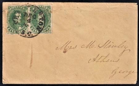 US CSA 1b Dark Green Pair on Cover Charleston, SC to Athens, GA, Dec. 4, 1862 – Left stamp in at UL, O/W 4 margins sound. cv $700