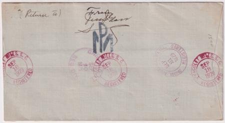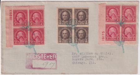 US Pacolet Mills, South Carolina 1929 (Sep 18) registered cover to W. H. Gilley with 2 x 634 blocks of 4 and 551 block of 4. Each block with 2 x Tulip fancy cancel, #867, in blue green. Chicago backstamp and “PM” fancy cancel #862 on reverse.