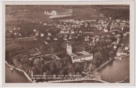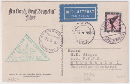 Germany 1930 (Sep 24) Baltic Sea Flight on PC with on board cancel. Stockholm drop, B & W Post Card of Aerial View of Friedrichshafen. S.88Dc