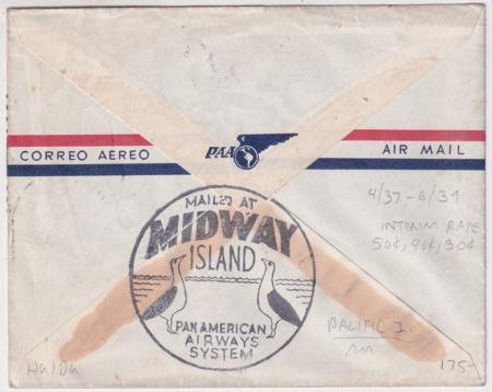 US 1938 (May 31) Small airmail cover from Honolulu, Hawaii with 2x C21, the 40c Interim Rate. “Mailed at Midway Island, Pan American Airways System” circular cachet6 on front and back.