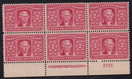US 324 Early Commemoratives NH VF Bottom Plate Block Of 6 #2155