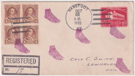 US Barefoot, Kentucky 1933 (Oct 21) Registered cover with 709 ( x4) on U525 with six strikes of Foot fancy cancel #44 in purple.