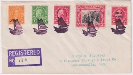 US Boat, Kentucky 1930 (Apr 25) Registered cover to F. Shockley with 632, 634, 642, 646 and 651 each stamp tied by single strike of Boat Fancy cancel #81 in purple.