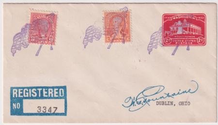 US Flagstaff, Arizona 1932 (Jun 14) Registered cover with designer W. Fountaine facsimile autograph with 640 and 711 on U525. Each stamp with a single strike of large American Flag fancy cancel #366 in purple.