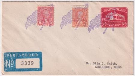 US Flagstaff, Arizona 1932 (Jun 14) Registered cover with 640 and 711 on U525. Each stamp with a single strike of large American Flag fancy cancel #366 in purple.