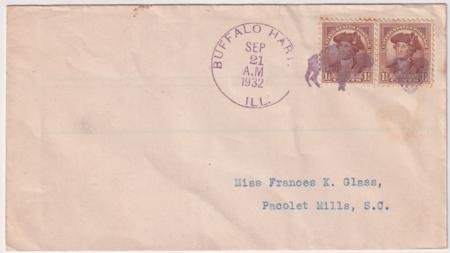 US Buffalo Hart, Illinois 1932 (Sep 21) Cover with 706 (x 2). Stamps tied by single strike of Buffalo and heart fancy cancel #108 in purple. Only listed First class and one day of usage. Soome faint toning.