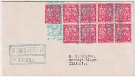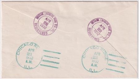 US Rogers Park Sta. Chicago, Illinois 1932 (Apr 22) Registered Cover (with receipt) with 717 (X9). Stamps tied by three strikes of large Girl Dancing by Tree unlisted fancy cancel in green.