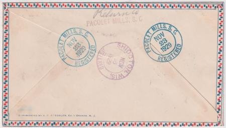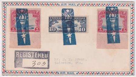 US Pacolet Mills, South Carolina 1929 (Nov 23) Registered airmail cover to H. M. Brehm with C10 and C11 (x 2). Each stampr tied by single strike of Torch with flame and stars fancy cancel #875 in blue.