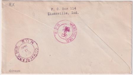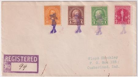 US Mexico, Indiana 1930 (Oct 9) Registered cover with 632, 636, 642 and 688 sent to Floyd Shockley. Each stamp tied by Man in Sombrero fancy cancel 745 in purple on top of same cancel in magenta. With registry receipt.