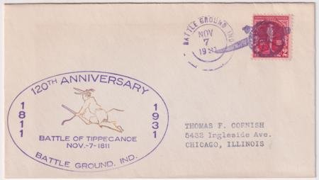 US Battle Ground, Indiana 1931 (Nov 7) Cacheted cover with 688 tied by Cannon fancy #49 in purple with Battle of Tippecanoe cachet in purple and brown.