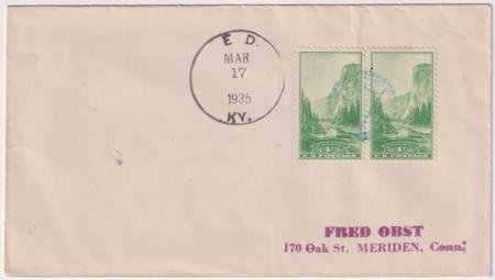 US ED, Kentucky 1935 (Mar 17) First Class cover with 740 pair. Stamps with a single strike of Ornate Harp in Circle fancy cancel #282 in blue.