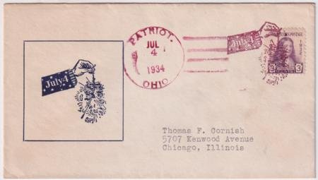 US Patriot, Ohio 1934 (Jul 4) Independence Day cacheted cover with 724 and single strike of Hand Holding Firecracker fancy cancel #903 in red. Only in use one day.