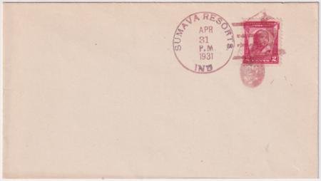 US Sumava Resorts, Indiana 1931 (Apr 31) Unaddressed Cover with 690 tied by a single strike of Peacock ulisted fancy cancel in red brown.