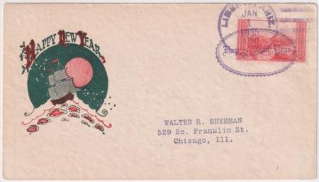 US Liberty, Arizona 1935 (Jan 1) Cacheted New Years cover with 741 and single strike of unlisted purple “Happy New Year” in Oval Fancy Cancel.
