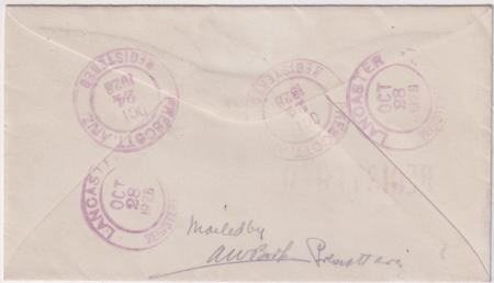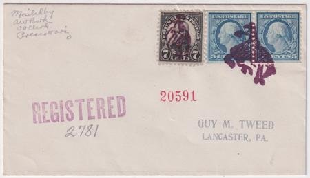 US Prescott, Arizona, 1928 (Oct 24) Small registered cover with 496 (x 2) and 639. Stamps are tied by one strike of Smoki Snake Dancer #943 and one strike of Bronco Rider #942 fancy cancels, both in purple.
