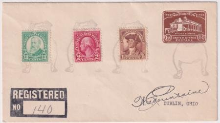 US Idaho, Yale 1932 (Jul 1) Registered cover with W.G. Fountaine facsimile autograph with 623, 634, 706 on U524. Each stamp tied by single strike of Bull Dog fancy cancel #1263 in black.