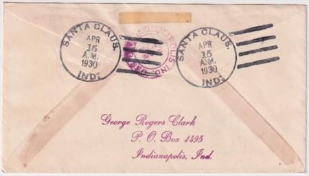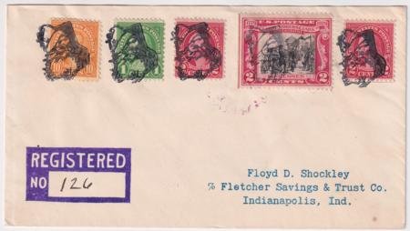 US Santa Claus, Indiana 1930 (Feb 17) Registered cover with Scott 632, 634 (x 2), 642 and 651. Each stamp tied by single strike of Santa Claus Bust fancy cancel #1031 in black.