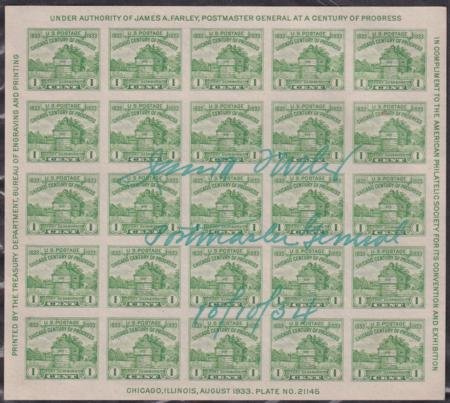 US 1933 Scott #730 S/S Signed by James Farley – dated 10/10/34 in blue-green as Postmaster General