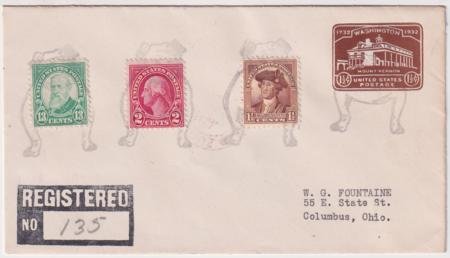 US Idaho, Yale 1932 (Jul 1) Registered cover sent to W.G. Fountaine with 623, 634, 706 on U524. Each stamp tied by single strike of Bull Dog fancy cancel #1263 in black.