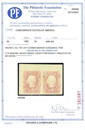 US Confederate States of America #8a Mint XF-Superb Pale Red Paid, Pristine OG, Left Stamp would be a truly superb Jumbo single est SMQ $600