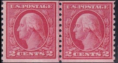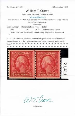 US George Washington and Ben Franklin #453 Mint F-VF Line pair, Left NH, Right Thin speck LH Crow Cert. Left Stamp NH VF 85 Jumbo SMQ450 Cat Value for lot 675