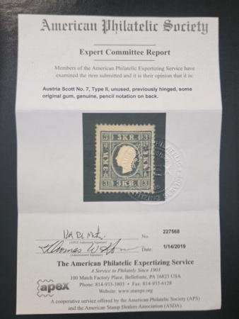 Austria #7 MINT F – VF Hinged, Very Fresh, large part OG APS cert Cat Value $2500