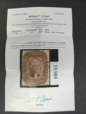 US Classics #29 Used F – VF Faint Diagonal crease UL Light cancel Crowe Cert Cat Value: $325