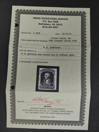 US Classics #39 Mint F – VF No gum, Weisz Cert Cat Value: $1400 as no gum