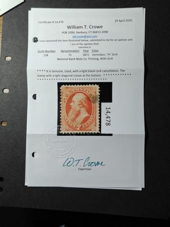 US Bank Notes #138 H grill Used Just Fine, Face Free cancel Crowe Cert, faint corner crease Cat Value: $525