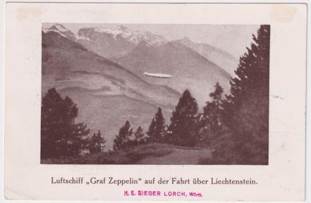 Liechtenstein 1931 (Jun 10) Specially Printed Postal Museum PPC with C7, 1fr Zeppelin. PPC in XF condition depicts airship in flight and is printed with “mit Zeppelin” on address side. LBK #2i Sfr 350