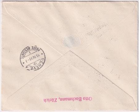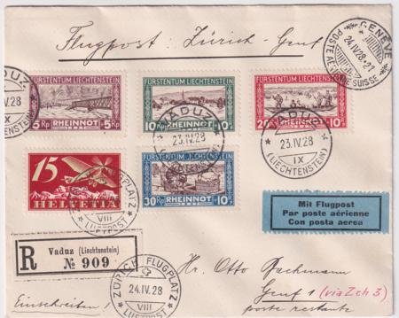 Liechtenstein / Switzerland 1928 (Apr 23) First Flight Geneva-Zurich-Munich-Vienna. Registered cover with Liechtenstein B7-10 postmarked April 23 then to Switzerland, C3 added and postmarked Apr 24. Backstamped Geneva. SLH Sfr. 1500 = $1625.RF28.ldL Very rare!
