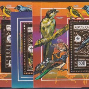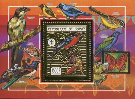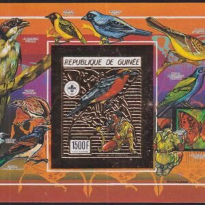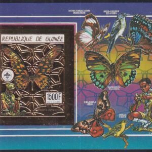 Guinea 1990 Gold Foil – – Four S/S, 2 x Perf, 2 x Imperf, Butterflies, Birds, Scouts