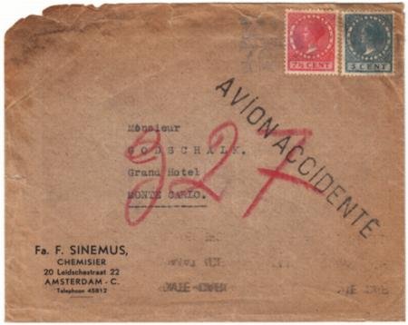 Netherlands / Belgium 1937 Early Airmail Flight Crash to Monaco, stamped “Avion Accidenté”