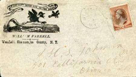 US Grey cover from circa 1900 with illustration of an insect flying away from a bird. with “If you don’t catch him in ten days, come back to ” printed at top of illustration.