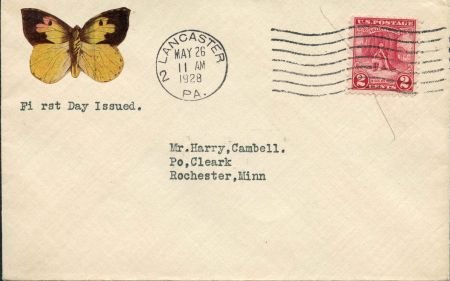 US 1928 #645 on 3 addressed FDC’s with colorful a Butterfly label added. Each cover with a different Butterfly, one label tied by typewriter inscription
