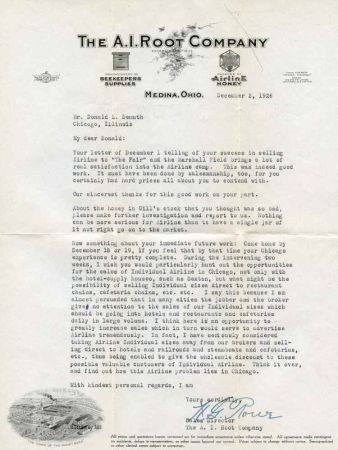 US 1926 Honey & Beekeeper Advertising Cover A.I. Root advertising cover for “Beekeepers Supplies” “Airline Honey” with letter on company stationery from sales director.