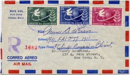 Costa Rica 1950 C186-C188 on registered airmail cover signed by pilot Clarence A. DeGiers