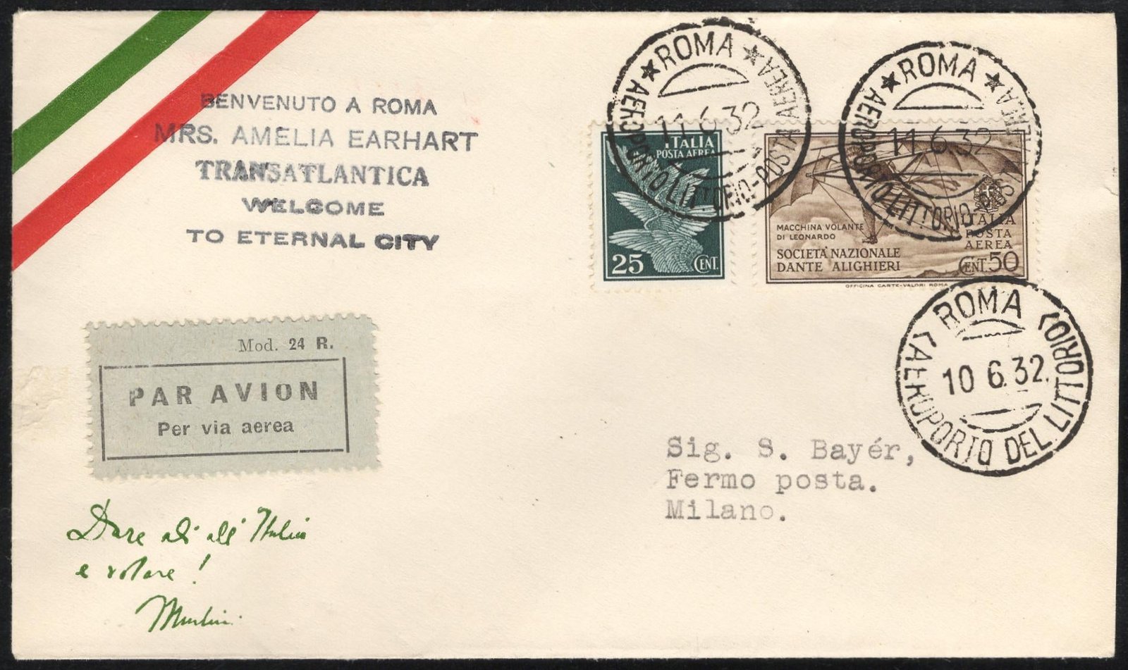 Italy 1932 (Jun 11 ) Airmail cover to Milan welcoming Amelia Earhart. Facsimile Mussolini signature in lower left.