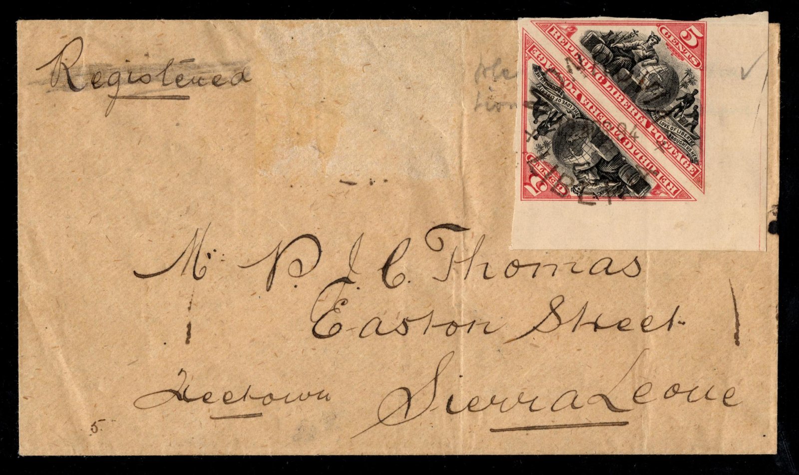 Liberia 1894 Cover to Sierra Leone with Scott 52 pair. Backstamped Sierra Leone and expert mark on reverse. Mi 43, SG 90