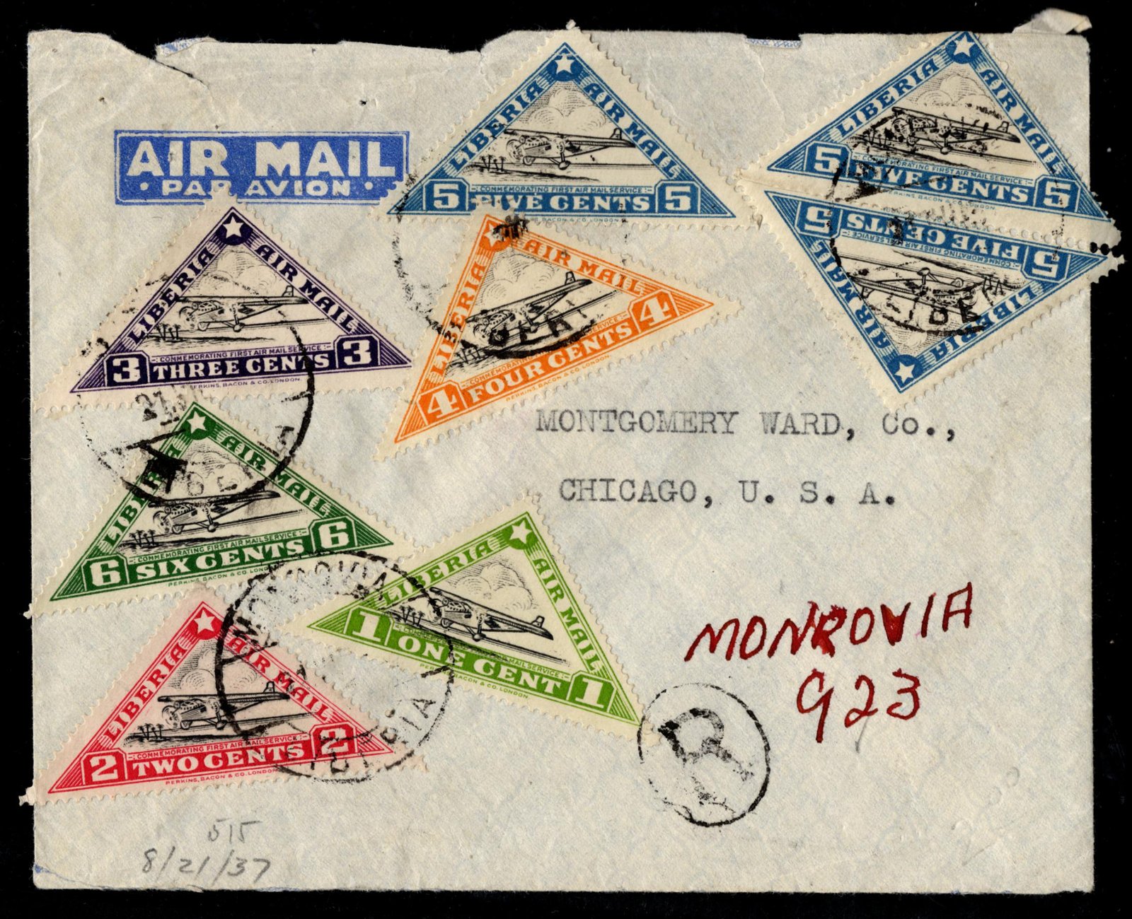 Liberia 1937 Registered Commercial Cover to Chicago, addressed to Montgomery Ward Co. Cover  with complete set C3A-F  + extra C3F, roughly opened at top, back flap missing.