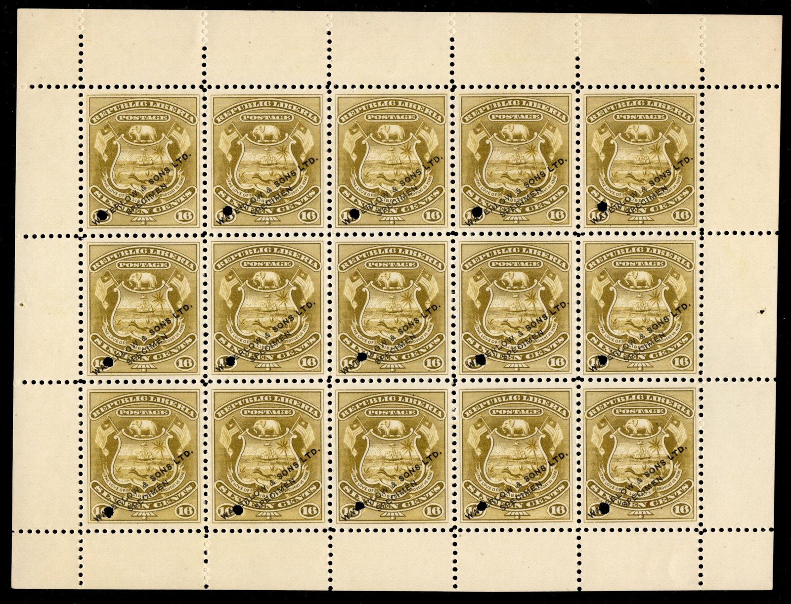 Liberia 41 var. in Olive Full sheet of Waterlow Specimen