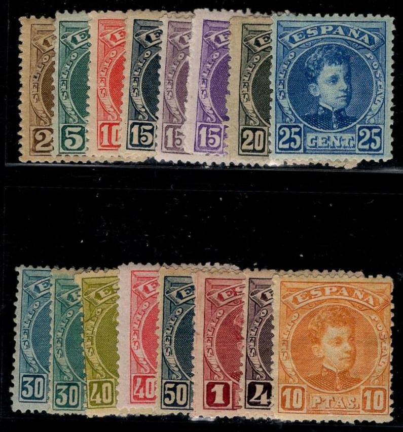 Spain 272-286 LH F-VF, fresh set. 281-82 Ave-F, 281 corner crease (cv 150), total cv 1124.