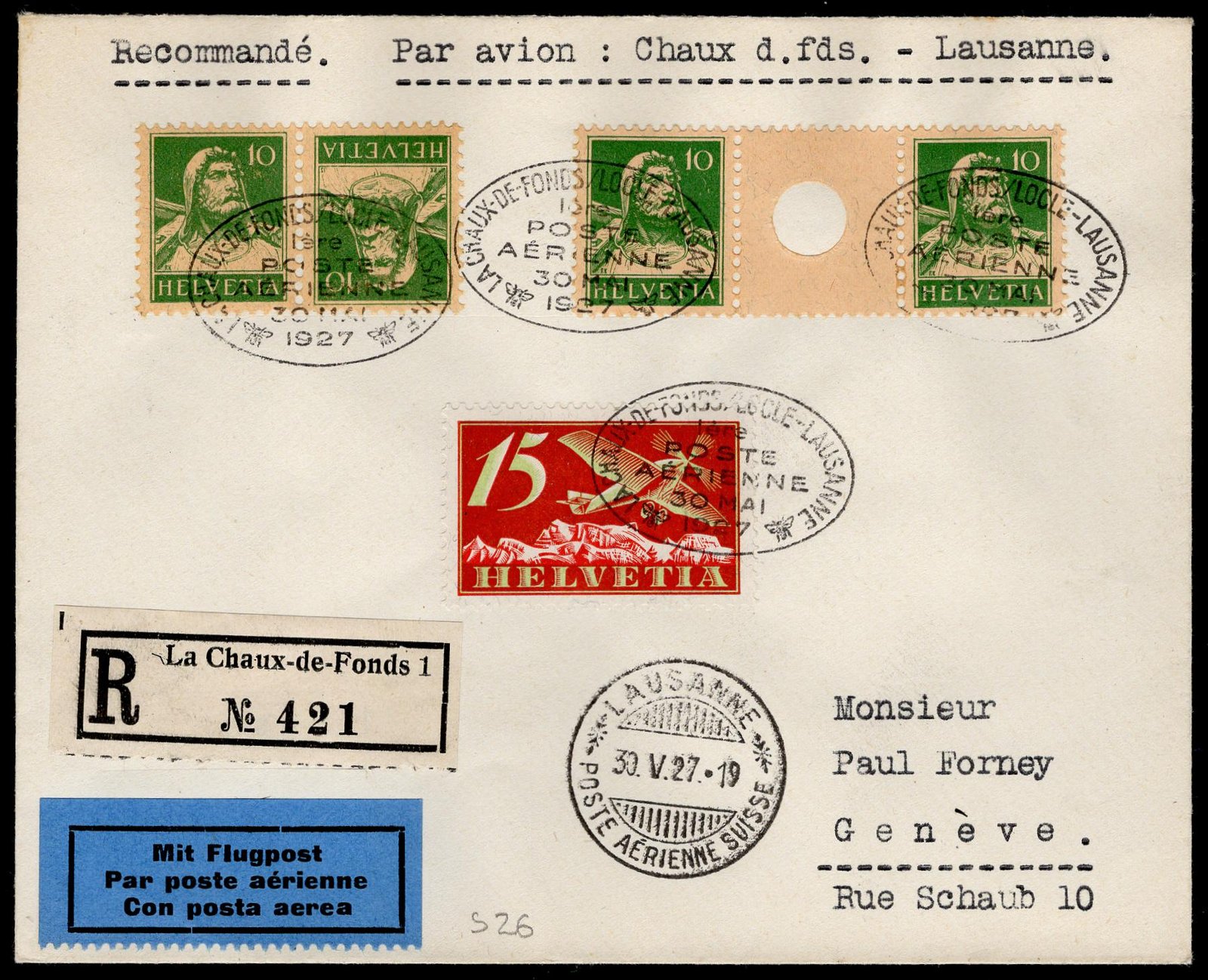 Switzerland 1927 Registered Airmail Cover with Zumstein S26 Interspace Pair