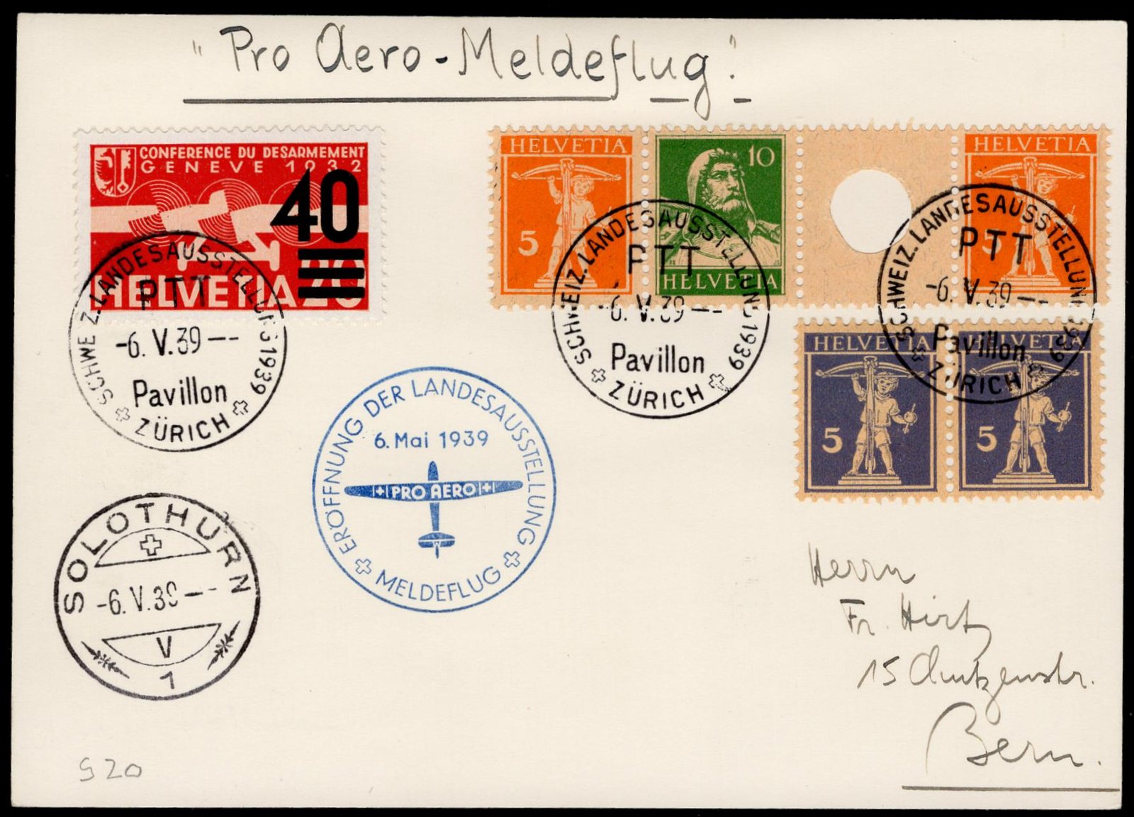 Switzerland 1939 (May 6) with Zumstein S20 on Card with Opening of the National Exhibit Cancels. Sfr 300