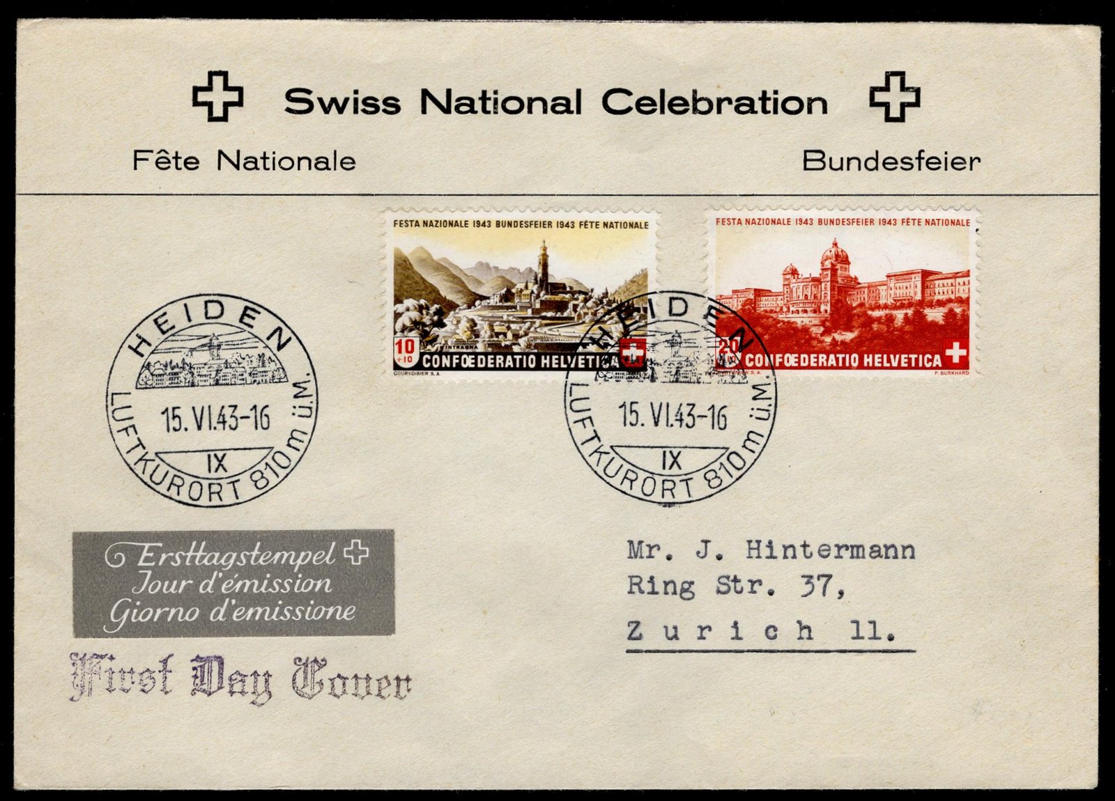 Switzerland 1943 #B124-125 Cacheted FDC XF Sent to Zurich