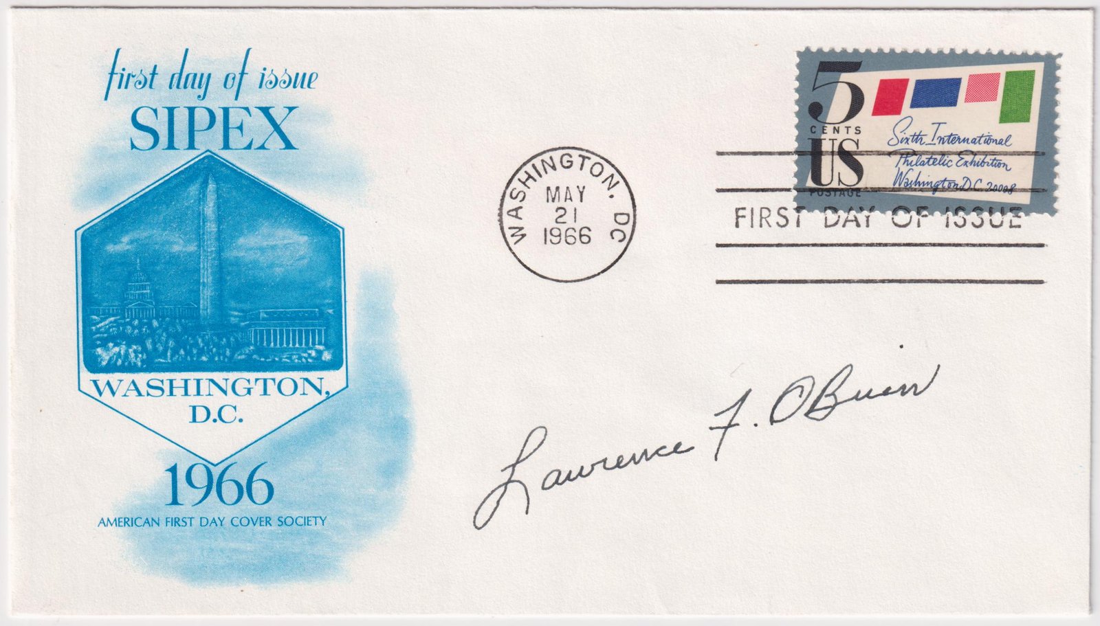 US 1966 (May 21) 1310 FDC Signed by Lawrence F. O’Brien, PMG 1965-1967