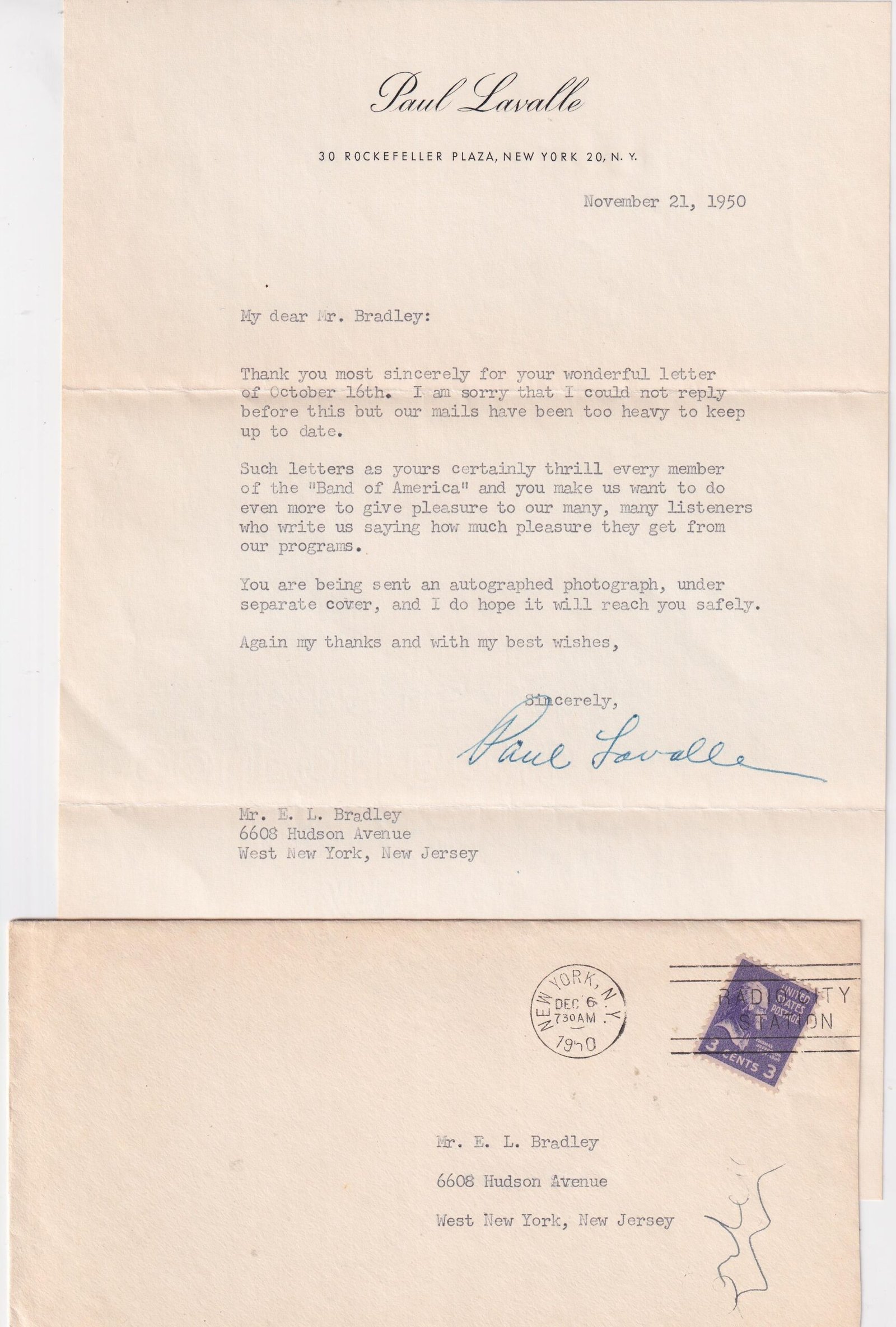 US 1950 Letter Signed by Musician Paul Lavalle. Cover included.