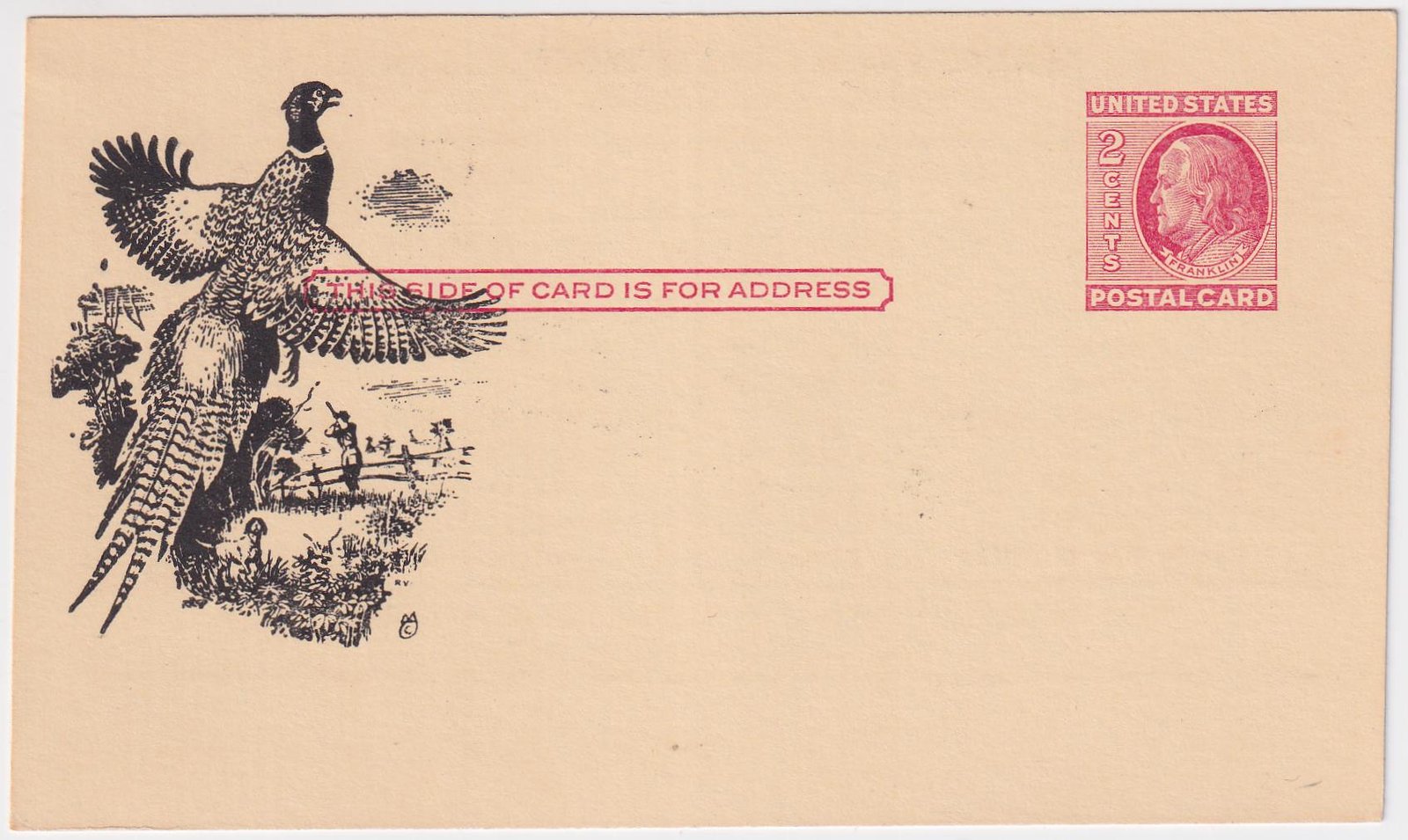 US 1951 UX38 with Bird Cachet. Cachet pictures quail, dog and hunter in a country scene. Advertising on front of postal cards was illegal so this is very rare!