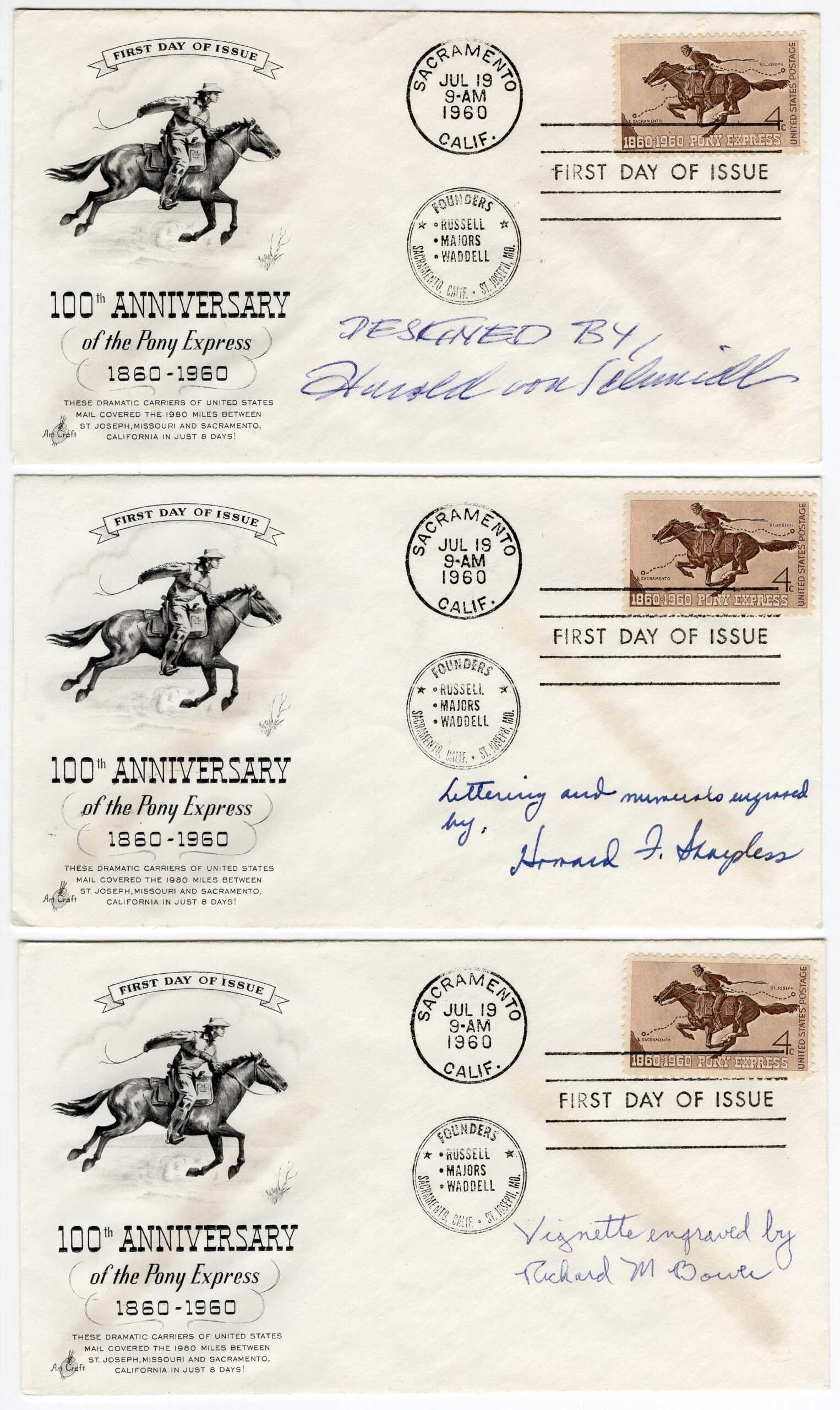 US 1960 (Jul 19) #1154  Set of 3 Matching FDC’s Each Signed by a Different Designer or Engraver.